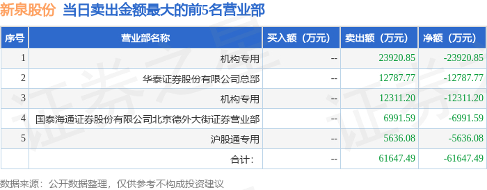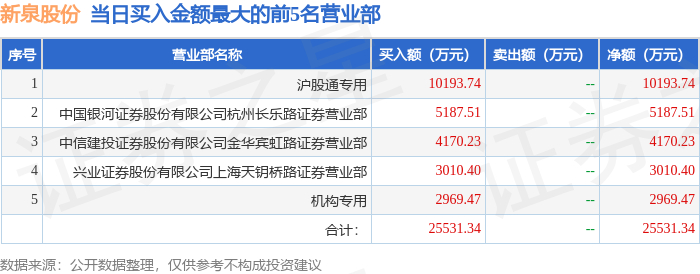 11月10日新泉股份(603179)龙虎榜数据:机构净卖出3.33亿元,北向资金净买入4557.66万元