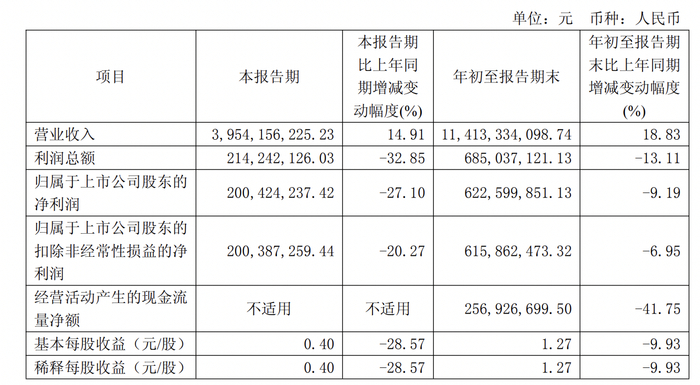 2025年前三季度,新泉股份营业收入为114.13亿元,同比增长18.83%;归属于上市公司股东的净利润6.23亿元,同比减少9.19%。