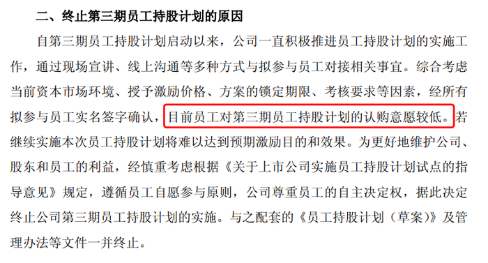 最终,经所有拟参与员工实名签字确认,目前员工对第三期员工持股计划的认购意愿较低。若继续实施本次员工持股计划将难以达到预期激励目的和效果。经慎重考虑,终止公司第三期员工持股计划的实施。