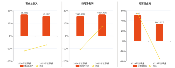 公司营业总收入为10.27亿元,在已披露的同业公司中排名第11,较去年同报告期营业总收入减少7953.41万元,同比较去年同期下降7.19%。归母净利润为8217.30万元。经营活动现金净流入为9443.02万元,较去年同报告期经营活动现金净流入减少4976.24万元,同比较去年同期下降34.51%。