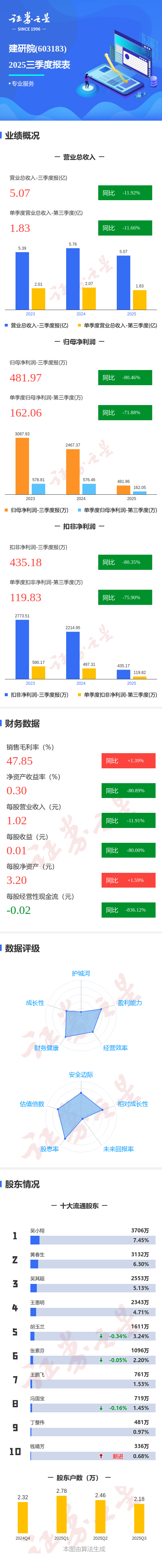 图解建研院三季报:第三季度单季净利润同比下降71.89%