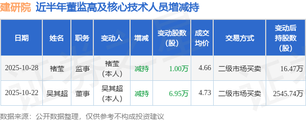 建研院近半年内的董监高及核心技术人员增减持详情如下: