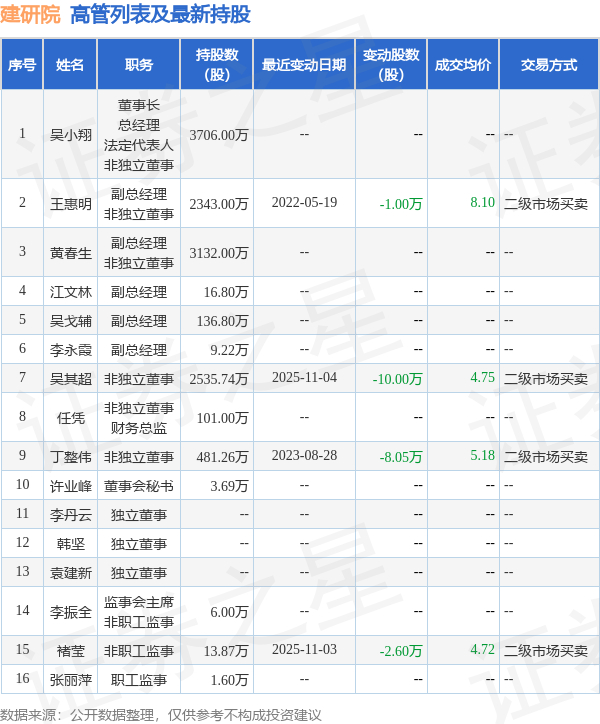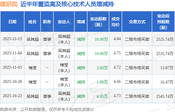 建研院近半年内的董监高及核心技术人员增减持详情如下: