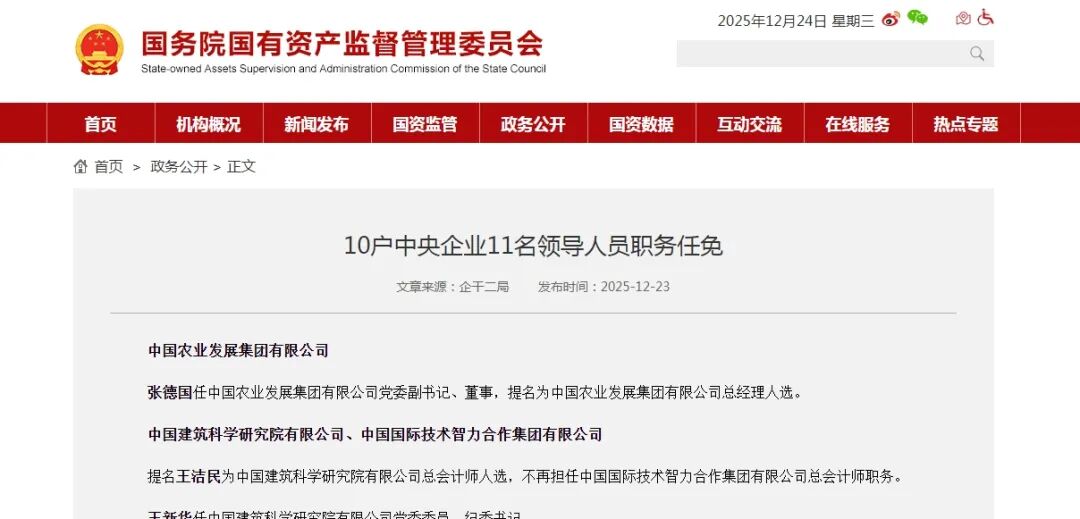 近日,国资委发布“10户中央企业11名领导人员职务任免”信息,建筑领域相关央企包括中国建筑科学研究院有限公司、中国建设科技有限公司。