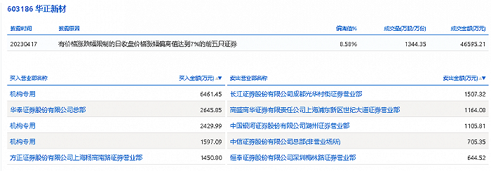 4月17日,华正新材今日涨停,龙虎榜数据显示,上榜营业部席位全天成交1.97亿元,占当日总成交金额比例为42.31%。其中,买入金额为1.46亿元,卖出金额为5127.08万元,合计净买入9458.1万元。