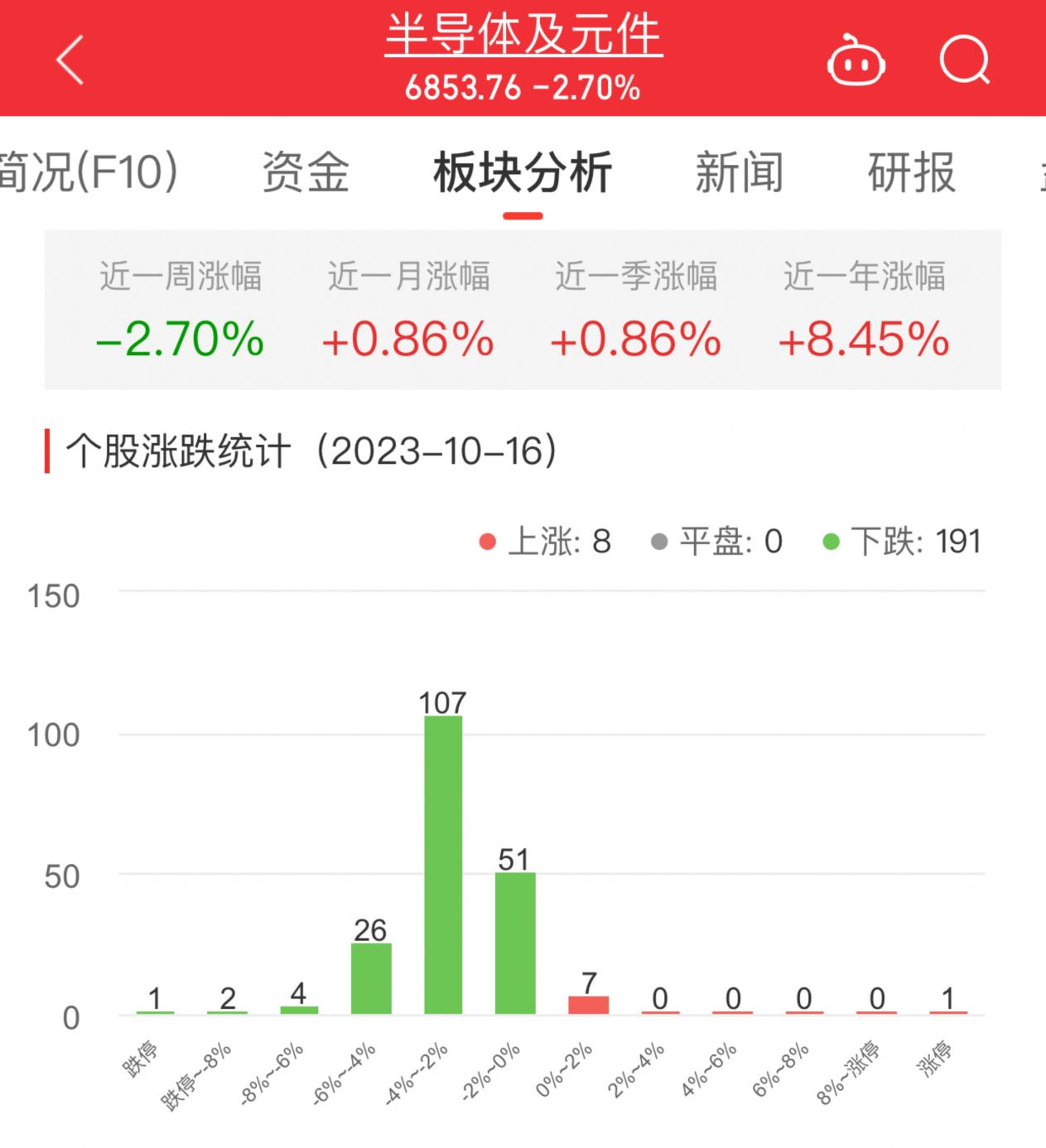 中国经济网北京10月16日讯 今日,半导体及元件板块整体跌幅2.70%,其中8只股票上涨,191只股票下跌。