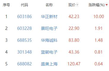其中,华正新材、景旺电子、华海诚科、蓝箭电子、盛美上海位列板块涨幅前五位,涨幅分别为10.00%、1.91%、1.48%、0.81%、0.64%。