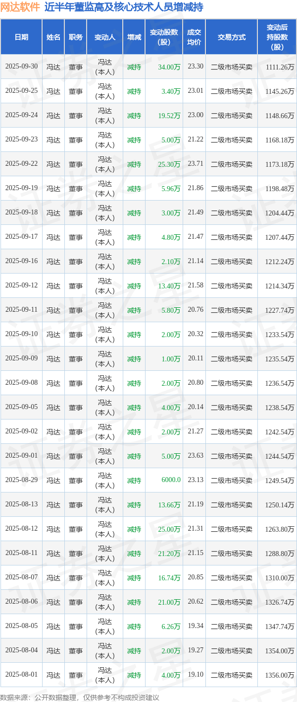 网达软件近半年内的董监高及核心技术人员增减持详情如下: