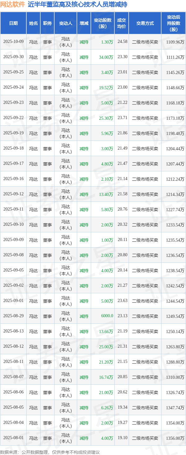 网达软件近半年内的董监高及核心技术人员增减持详情如下: