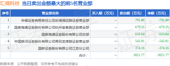 证券之星消息,沪深交易所2025年11月4日公布的交易公开信息显示,汇得科技(603192)因有价格涨跌幅限制的日收盘价格跌幅偏离值达到7%的前五只证券登上龙虎榜。此次是近5个交易日内第2次上榜。