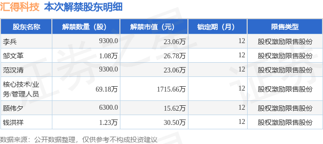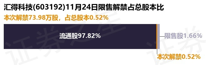 汇得科技(603192)73.98万股限售股将于11月24日解禁,占总股本0.52%