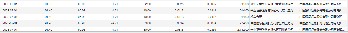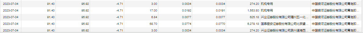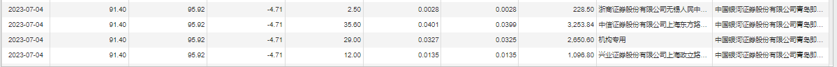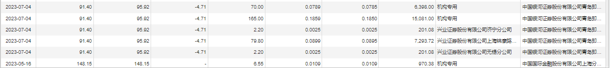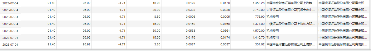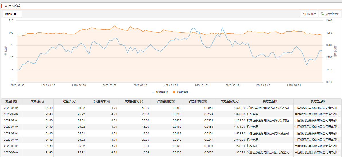 7月4日大宗交易成交1779.19万股,成交额16.26亿元,占当日总成交额的93.99%,成交价91.4元,较市场收盘价95.92元折价4.71%。