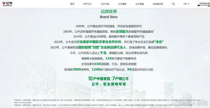 公牛集团官网首页显示,在广告语“10户中国家庭,7户用公牛”下方有两行小字,写着“数据来源:尚普咨询集团;覆盖全国(不包含港澳台)家用全渠道市场;基于行业专家调研、消费者调研与渗透率数据,得出:正在使用或曾经使用过公牛产品(电连接、墙壁开关插座、LED 照明、数码配件等)的家庭超过中国家庭总量的70%。统计时间:2021年1月1日至2024年12月31日;本声明于2025年8月完成调研。”