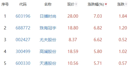 其中,日播时尚、珠海冠宇、尤夫股份、高澜股份、天通股份位列板块涨幅前五位,涨幅分别为7.03%、6.82%、6.62%、5.80%、5.71%。