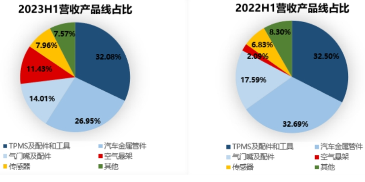 据2023年半年报,保隆科技主要产品有汽车轮胎压力监测系统(TPMS)、空气悬架系统、车用传感器(压力、光雨量、速度、位置、加速度和电流类为主)、ADAS(高级辅助驾驶系统)、汽车金属管件(轻量化底盘与车身结构件、排气系统管件和EGR管件)、气门嘴以及平衡块等。