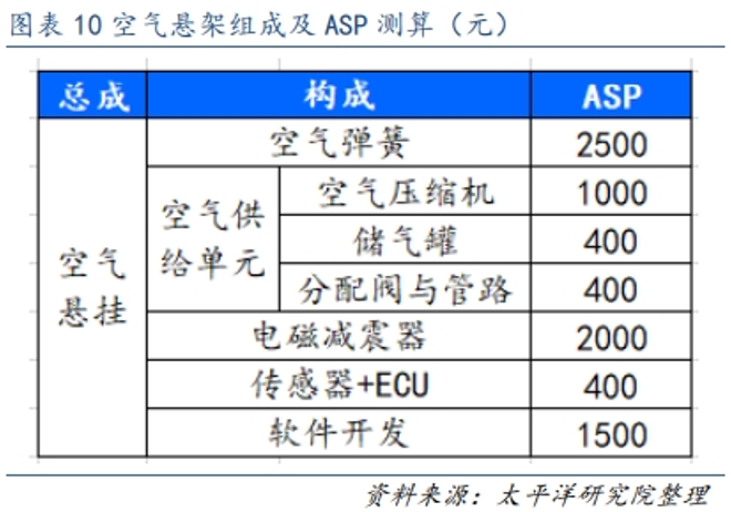 空气悬架组成及ASP测算(截图自太平洋证券)9月27日,太平洋证券发布的研报称,空气悬挂系统主要由空气供给系统(压缩机、 储气罐、分配阀)、ECU、空气弹簧、电磁减振器、各类传感器构成。保隆科技目前已经实现空气弹簧、储气罐、传感器、ECU的自制配套及外购空气压缩机、分配阀组装成空气供给单元配套,公司空悬总成产品切入智界S7车型。
