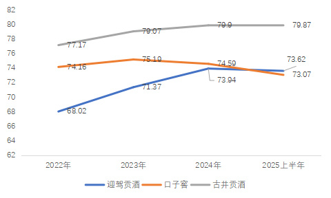 而产品盈利方面,公司相较于竞争对手古井贡酒而言同样逊色。尽管公司过往三年毛利率水平小幅改善,但上半年73.62%的毛利率水平表现相较于古井贡酒的79.87%而言,仍然存有较为明显的差距。