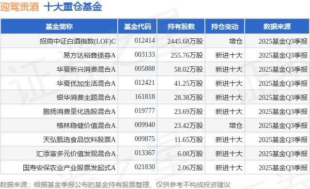根据2025基金Q3季报公募基金重仓股数据,重仓该股的公募基金共13家,其中持有数量最多的公募基金为招商基金的招商中证白酒指数(LOF)C。招商中证白酒指数(LOF)C目前规模为150.16亿元,最新净值0.7652(11月7日),较上一交易日下跌0.31%,近一年下跌18.24%。该公募基金现任基金经理为侯昊。侯昊在任的基金产品包括:招商大宗商品(LOF),管理时间为2017年9月5日至今,期间收益率为66.47%;招商中证银行指数A,管理时间为2017年9月5日至今,期间收益率为80.65%;招商深证100指数A,管理时间为2017年9月5日至今,期间收益率为71.82%;招商央视财经50指数A,管理时间为2017年9月5日至今,期间收益率为79.29%。