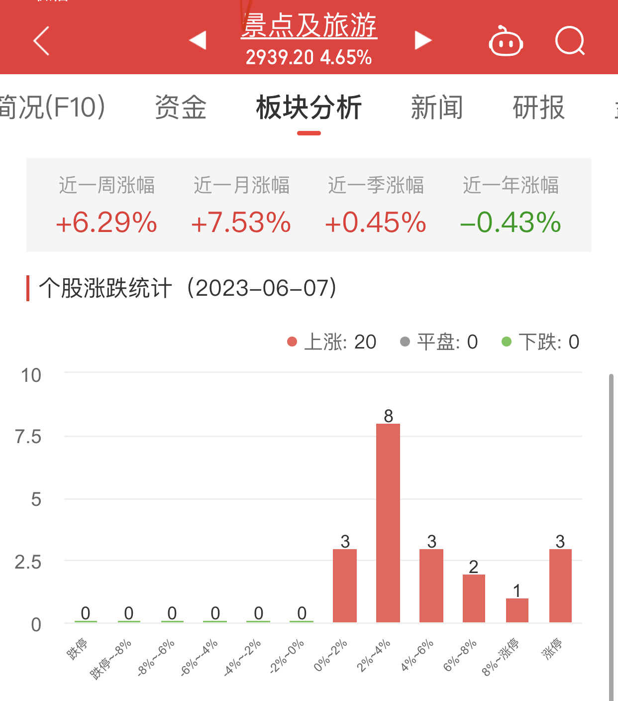 中国经济网北京6月7日讯 今日,景点及旅游板块整体涨幅4.65%,其中20只股票上涨。