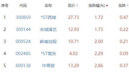 *ST西域、宋城演艺、岭南控股、*ST雪发、中青旅位列涨幅榜后五位,涨幅分别为1.72%、1.73%、2.00%、2.29%、2.86%。