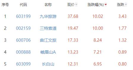 其中,九华旅游、三特索道、曲江文旅、峨眉山A、长白山位列板块涨幅前五位,涨幅分别为10.02%、10.00%、8.24%、7.21%、6.95%。