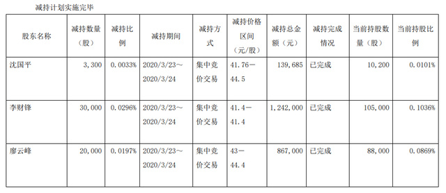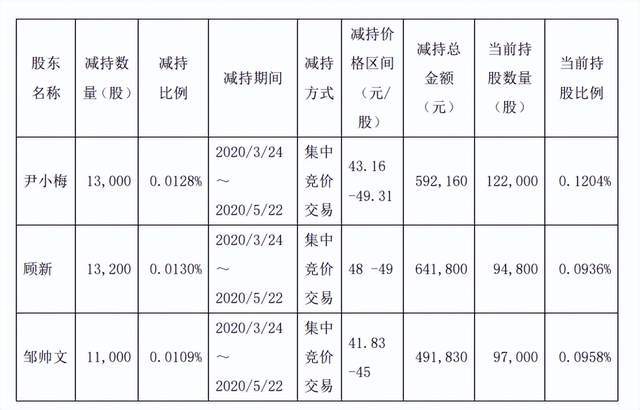 2020年5月23日公告,董事兼副总经理尹小梅、副总经理顾新、副总经理邹帅文邹帅文分别减持1.3万股、1.32万股和1.1万股;5月29日,公告监事吴蕾减持5000股……
