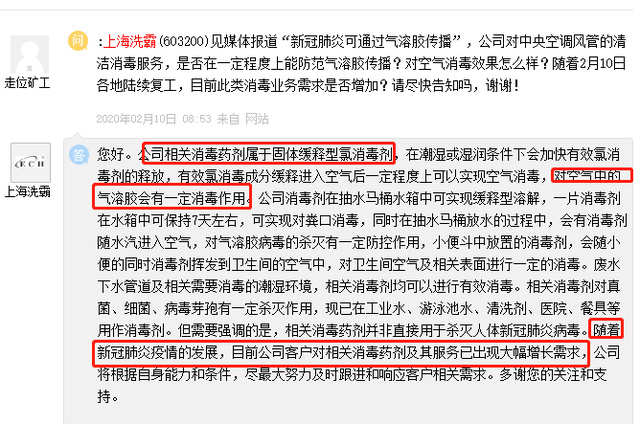 上海洗霸在互动平台称:公司相关消毒药剂属于固体缓释型氯消毒剂,进入空气后一定程度上可以实现空气消毒,对空气中的气溶胶会有一定的消毒作用。……随着新冠肺炎疫情的发展,