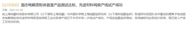 2023年1月28日,上海洗霸在其官网发布“固态电解质粉体首釜产品测试达标,先进材料吨级产线试产成功” 的消息,声称与中科院上海硅酸盐所张涛团队合作的锂离子电池固态电解质粉体先进材料已经一次试产成功,相关主体已经与天津某电池企业达成初步合作意向,后续拟率先头用于无人机等应用场景。