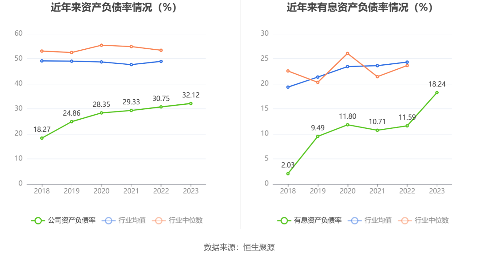 在偿债能力方面,公司2023年年末资产负债率为32.12%,相比上年末上升1.37个百分点;有息资产负债率为18.24%,相比上年末上升6.65个百分点。