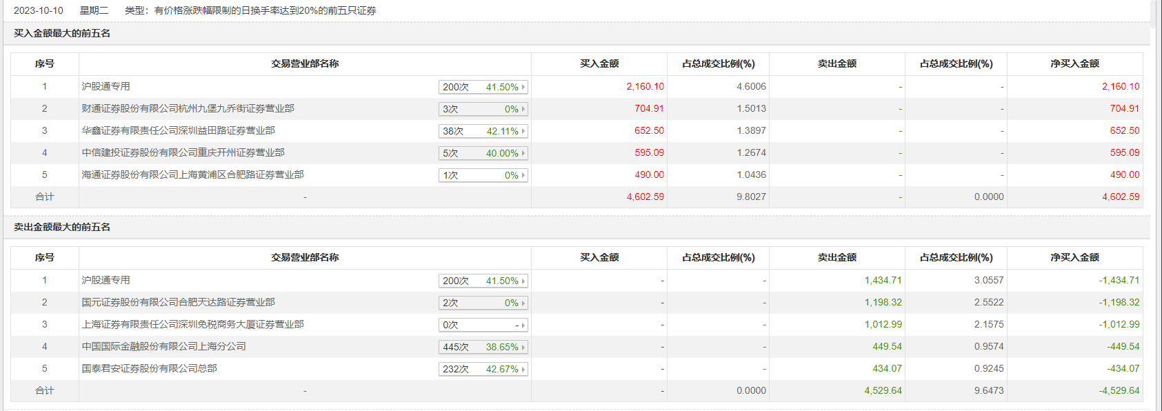 具体来看,沪股通专用、财通证券杭州九堡九乔街证券营业部分别买入2160.10万元、704.91万元;沪股通专用、国元证券合肥天达路证券营业部分别卖出1434.71万元、1198.32万元。