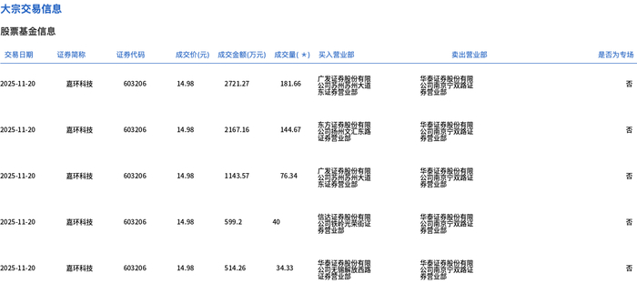 11月20日,嘉环科技大宗交易成交477万股,成交额7145.46万元,占当日总成交额的65.67%,成交价14.98元,较市场收盘价16.49元折价9.16%。