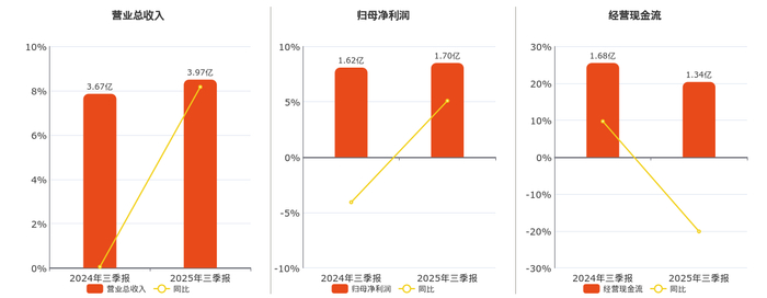 公司营业总收入为3.97亿元。归母净利润为1.70亿元。经营活动现金净流入为1.34亿元,较去年同报告期经营活动现金净流入减少3373.22万元,同比较去年同期下降20.12%。