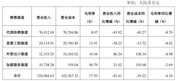 从销售渠道看,江山欧派在本报告期内呈现出“营收增长分化、毛利率普遍承压”的特点。占公司总收入超过六成的代理经销渠道,营收同比下滑45.92%,毛利率亦减少8.70个百分点;直营工程渠道收入降幅最为显著,达58.25%,毛利率同步下降8.42个百分点。尽管外贸出口渠道营收实现86.24%的较高增长,但其整体占比仍不足一成,且毛利率同比下降8.98%。此外,加盟服务渠道收入增长21.02%,但毛利率同样未能独善其身,下滑2.69个百分点。