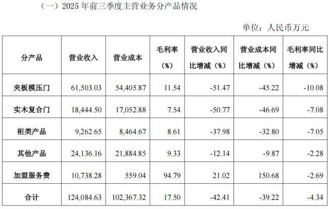 从业务构成来看,本报告期内,江山欧派产品端全线承压。占营收比重过半的夹板模压门,收入同比下滑51.47%,毛利率亦减少10.08个百分点;实木复合门业务收入降幅同样超过50%,毛利率下降7.08个百分点。此外,柜类产品与其他产品的营收也分别下滑37.98%和12.14%。在整体下行态势中,加盟服务费成为唯一增长亮点,收入同比增长21.02%,但其毛利率也未能幸免,同比下滑2.69个百分点。