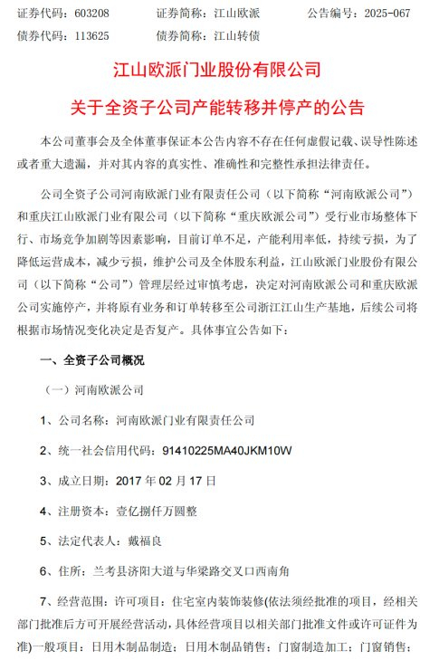 公告内容显示,两家停产子公司中,河南欧派成立于2017年,重庆欧派则于2020年设立。截至2025年9月30日,河南欧派总资产为2.81亿元,净资产2.46亿元,较2024年末均有所下降;重庆欧派总资产为3.42亿元,净资产则为-750.99万元,表明该公司已处于资不抵债的财务困境中。