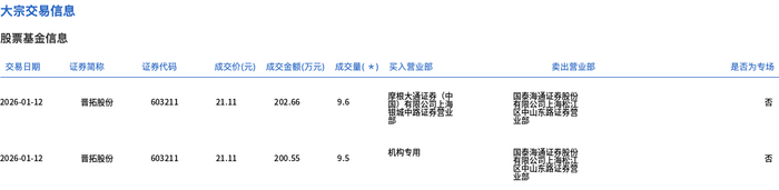 1月12日,晋拓股份大宗交易成交19.1万股,成交额403.21万元,占当日总成交额的1.19%,成交价21.11元,较市场收盘价23.51元折价10.21%。