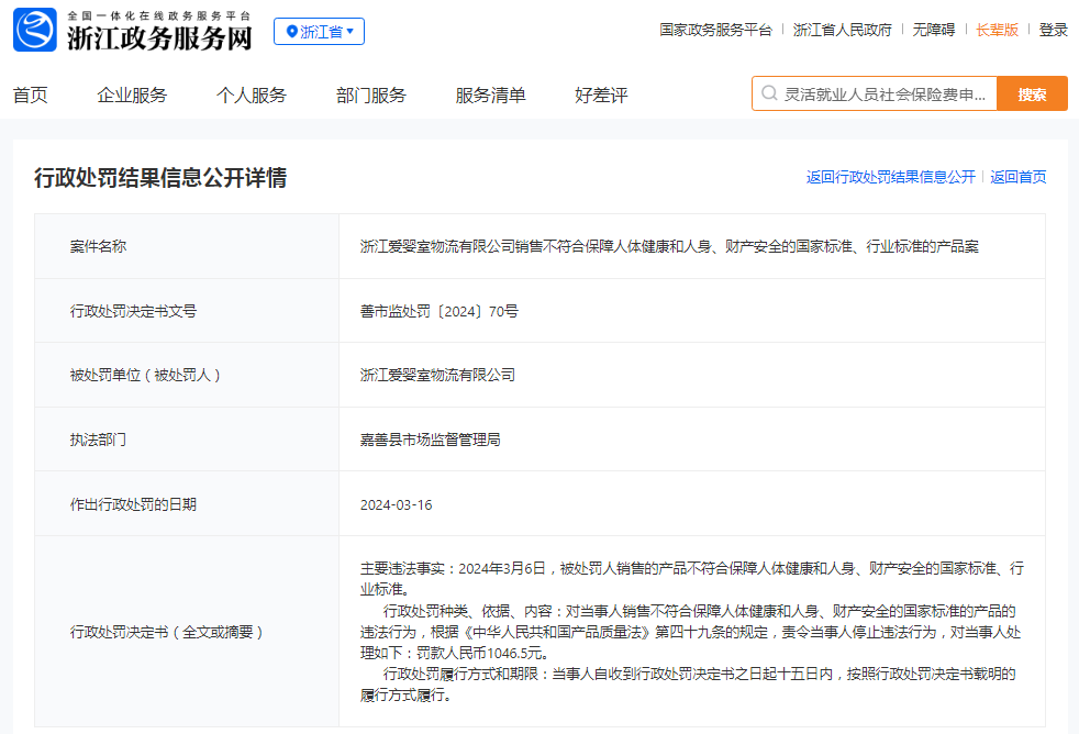 浙江爱婴室物流有限公司销售不符合保障人体健康和人身、财产安全的国家标准、行业标准的产品案