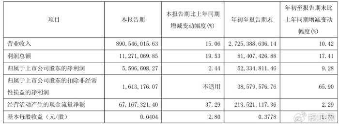 其中第三季度营收8.91亿元,同比增长15.06%;归母净利润559.66万元。同比增长2.44%;经营活动产生的现金流量净额6716.73万元。