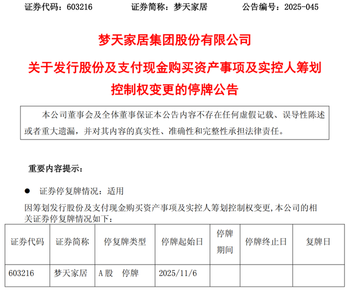 DoNews11月7日消息,据21世纪经济报道报道,11月5日晚,梦天家居公告,因筹划发行股份及支付现金购买资产事项及实控人筹划控制权变更,公司股票自11月6日开市起停牌,预计停牌不超过10个交易日。梦天家居最新股价报15.70元/股,总市值34.96亿元。
