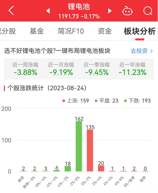中国经济网北京8月24日讯今日,锂电池板块整体跌幅0.17%,其中159只股票上涨,23只股票平盘,193只股票下跌。