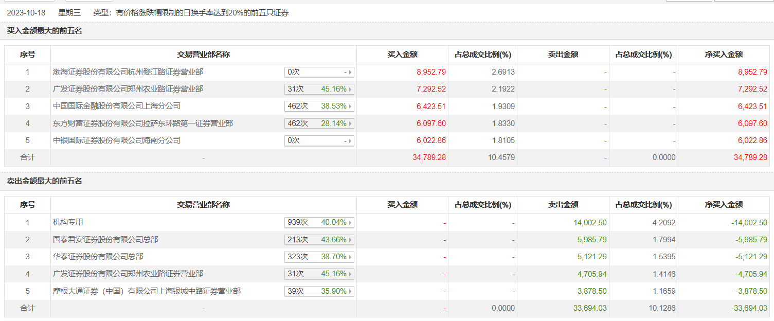 10月18日涨5.56%,成交额33.27亿元,换手率27.69%,盘后龙虎榜数据显示,一机构净卖出1.40亿元。
