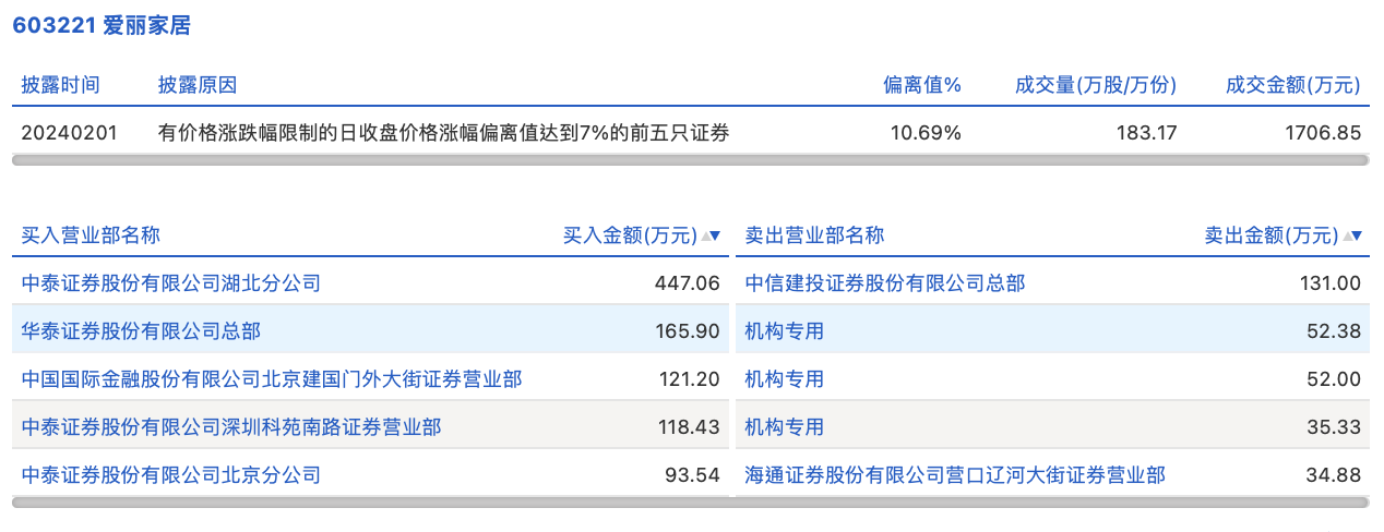 2月1日,爱丽家居今日涨停,全天换手率达0.76%,振幅达5.14%。龙虎榜数据显示,营业部席位合计净买入640.56万元。其中,机构合计净卖出139.7万元。此外,中泰证券湖北分公司、华泰证券总部分别买入447.06万元、165.90万元;中信建投证券总部、海通证券营口辽河大街证券营业部分别卖出131.00万元、34.88万元。