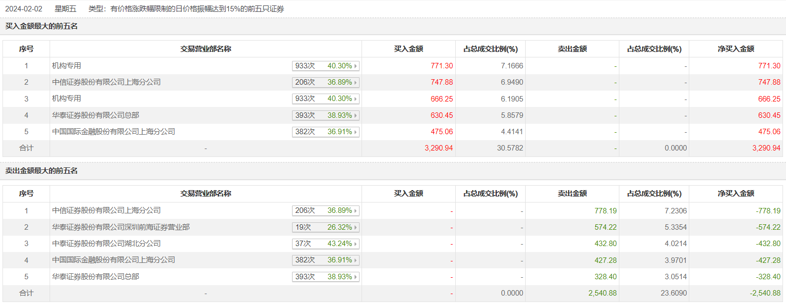 爱丽家居2月2日跌停,全天换手率达4.89%,振幅达19.85%。龙虎榜数据显示,营业部席位合计净买入750.05万元。其中,机构合计净买入1437.55万元。此外,中信证券上海分公司、华泰证券深圳前海证券营业部分别卖出778.19万元、574.22万元;中信证券上海分公司、华泰证券总部分别买入747.88万元、630.45万元。