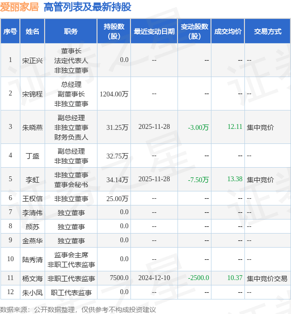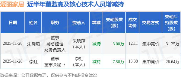 爱丽家居:11月28日高管朱晓燕、李虹减持股份合计10.5万股