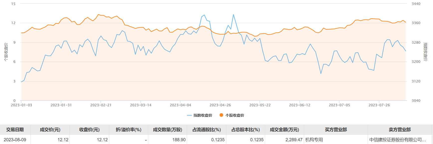 8月9日大宗交易成交188.9万股,成交额2289.47万元,占当日总成交额的17.88%,成交价12.12元,较市场收盘价12.12元持平。