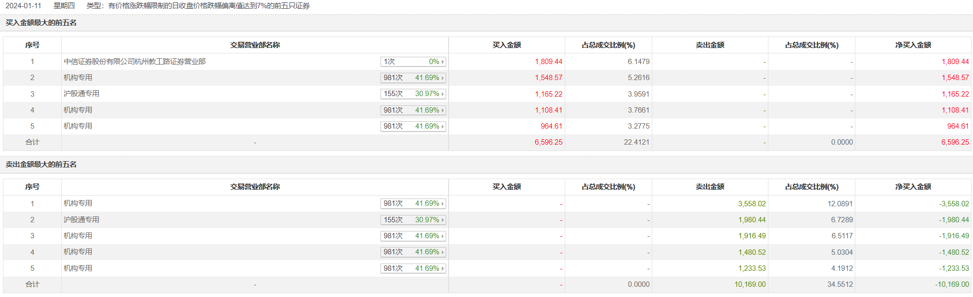 新凤鸣1月11日跌9.94%,全天换手率达1.53%,振幅达5%。龙虎榜数据显示,营业部席位合计净卖出3572.74万元。其中,机构买入3621.59万元,卖出8188.56万元,合计净卖出4566.96万元。此外,沪股通专用分别卖出1980.44万元;中信证券杭州教工路证券营业部、沪股通专用分别买入1809.44万元、1165.22万元。