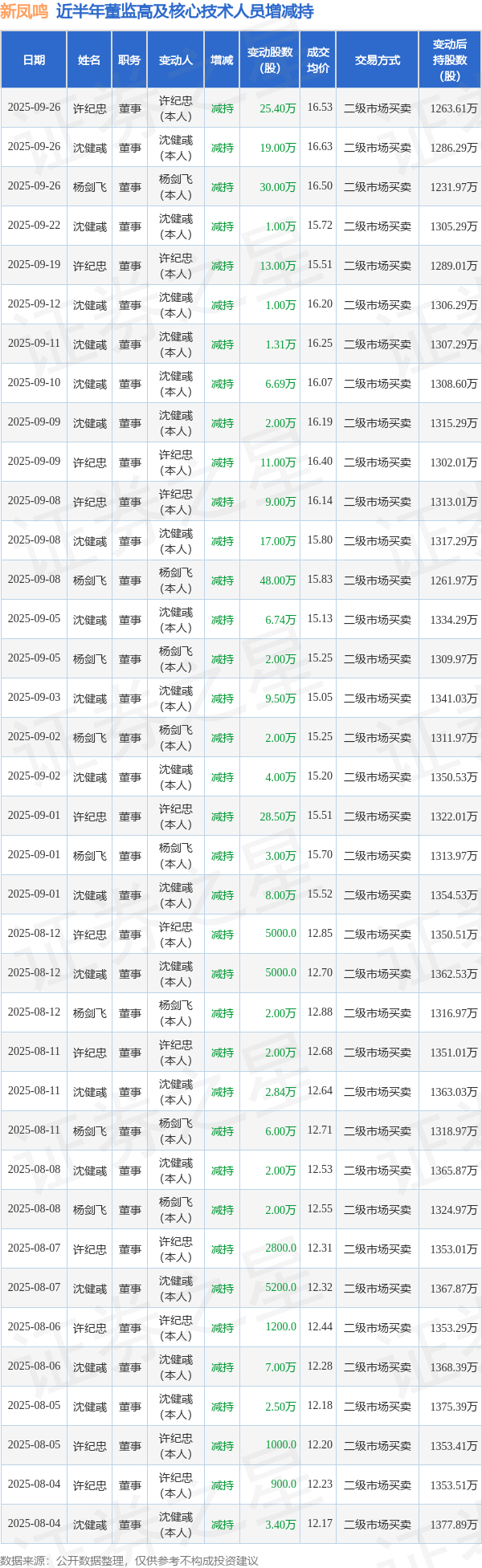 新凤鸣近半年内的董监高及核心技术人员增减持详情如下: