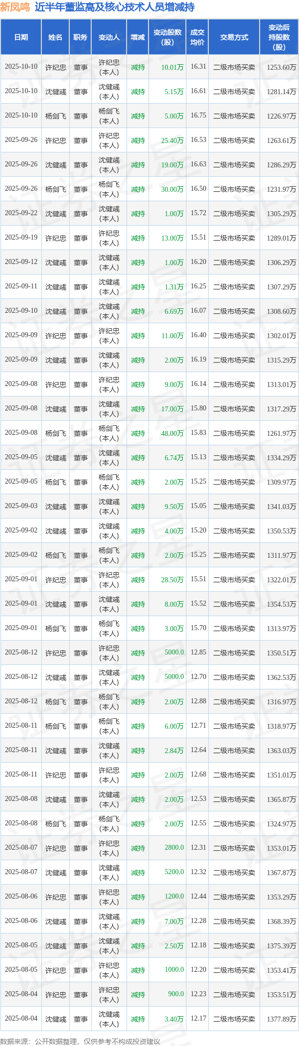 新凤鸣近半年内的董监高及核心技术人员增减持详情如下: