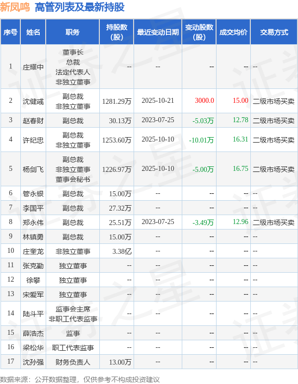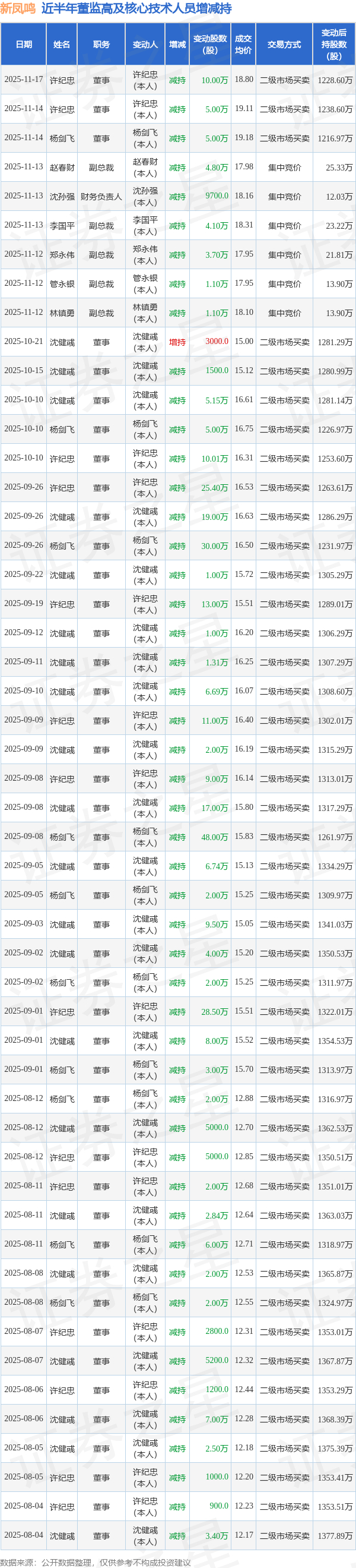 证券之星消息,根据11月18日市场公开信息、上市公司公告及交易所披露数据整理,新凤鸣(603225)最新董监高及相关人员股份变动情况:2025年11月17日公司董事许纪忠共减持公司股份10.0万股,占公司总股本为0.0066%。变动期间公司股价上涨2.84%,11月17日当日收盘报18.48元。
