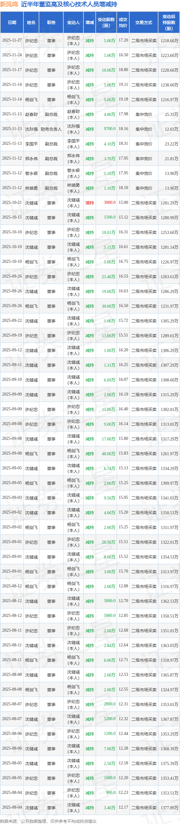 新凤鸣近半年内的董监高及核心技术人员增减持详情如下: